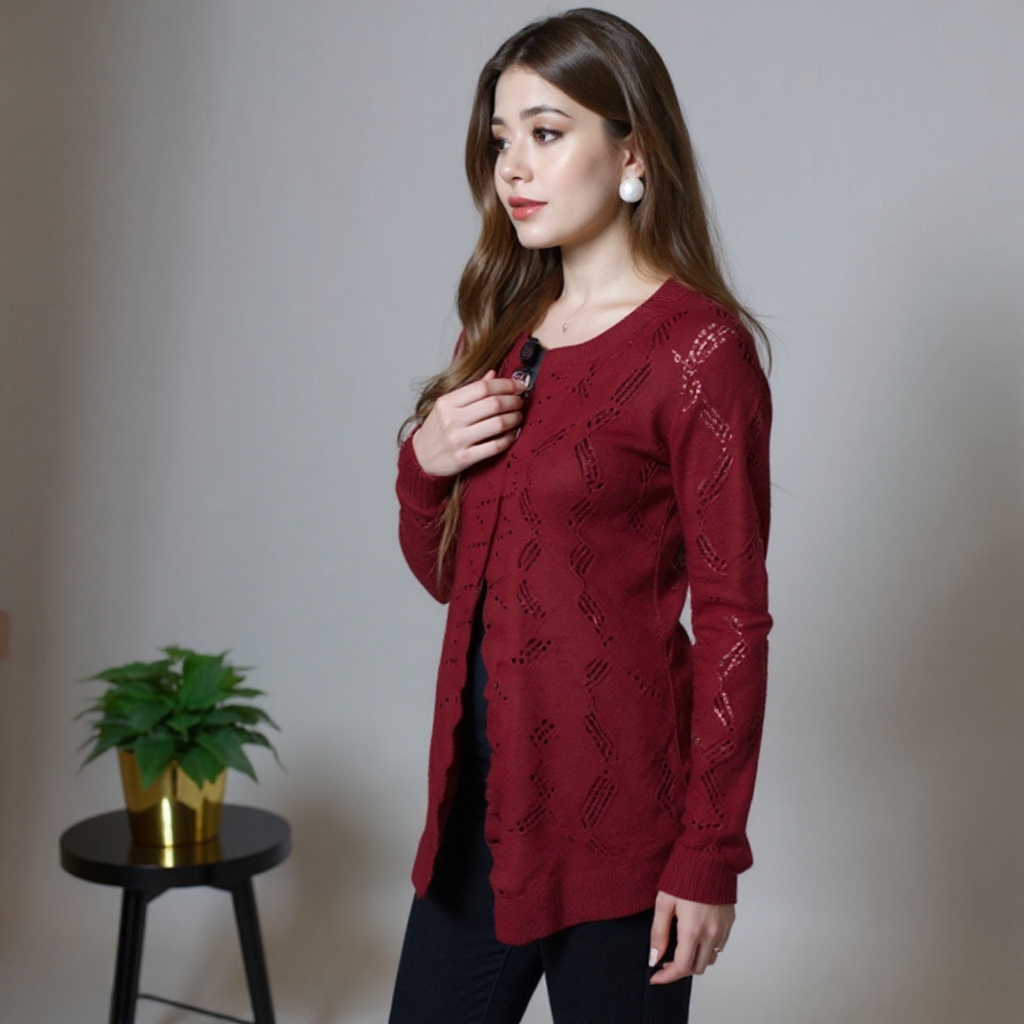 Embrace timeless elegance with this classic maroon crochet long cardigan, designed to keep you stylish and comfortable throughout the season. Made from premium acrylic wool, this piece offers warmth, softness, and a touch of luxury. The intricate crochet knit pattern adds a refined, handcrafted charm — perfect for layering over tops, turtlenecks, or dresses.