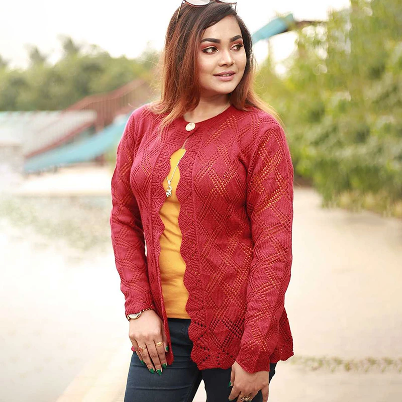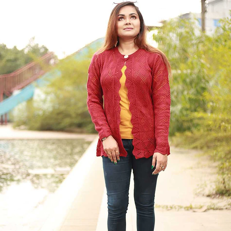 Enhance your everyday style with this elegant maroon crochet cardigan. Made from soft and breathable fabric, it provides all-day comfort and a fashionable look. The scalloped open-front design and intricate patterns make it ideal for both casual outings and special occasions.