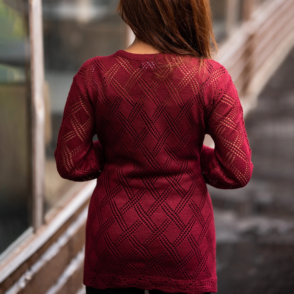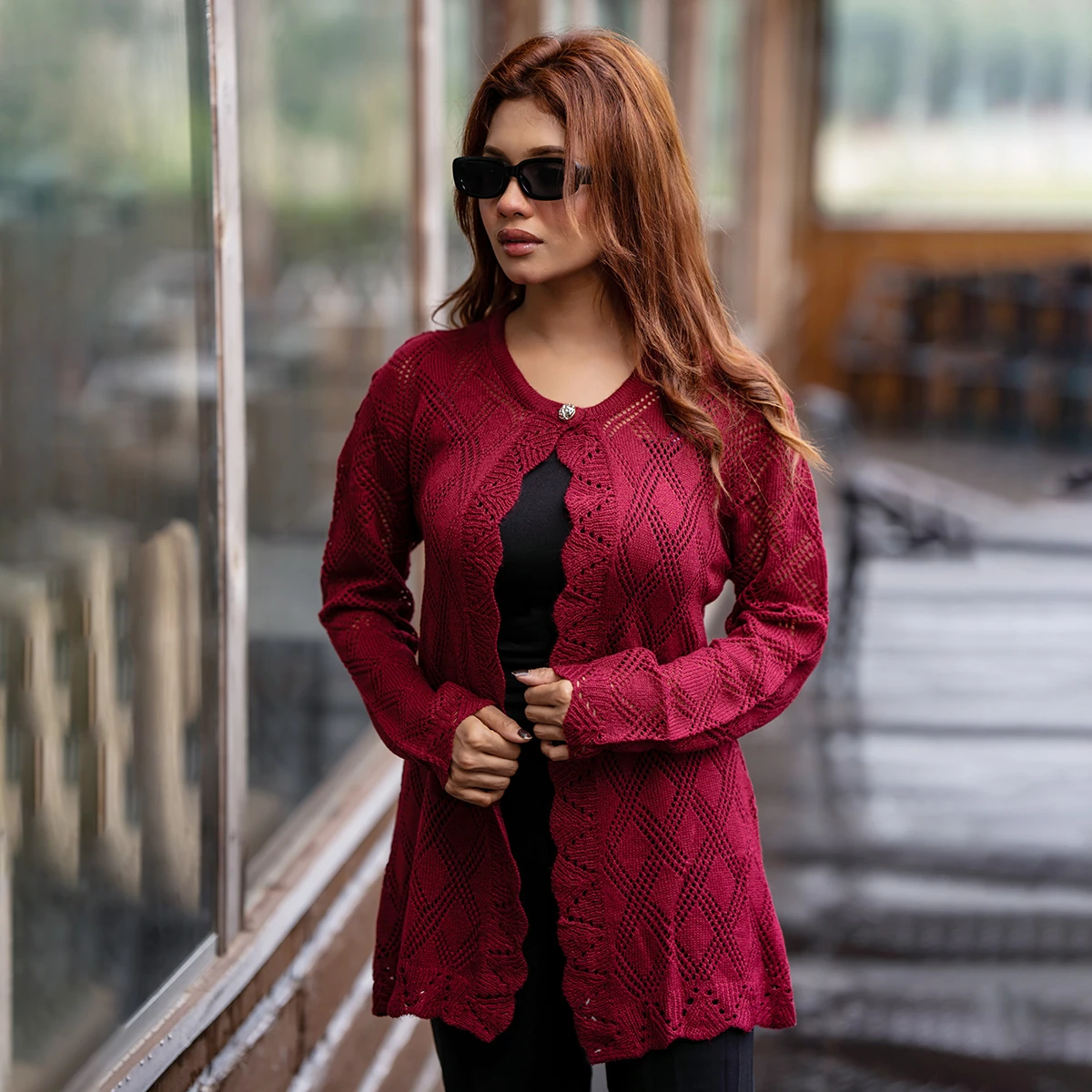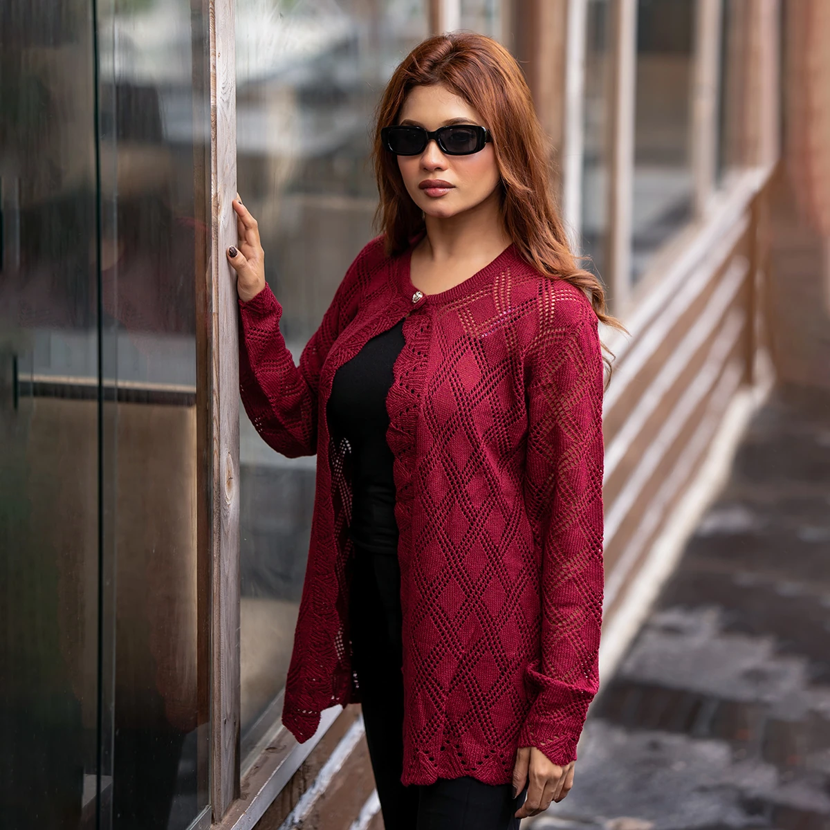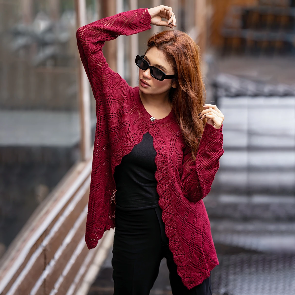 Enhance your everyday style with this elegant maroon crochet cardigan. Made from soft and breathable fabric, it provides all-day comfort and a fashionable look. The scalloped open-front design and intricate patterns make it ideal for both casual outings and special occasions.