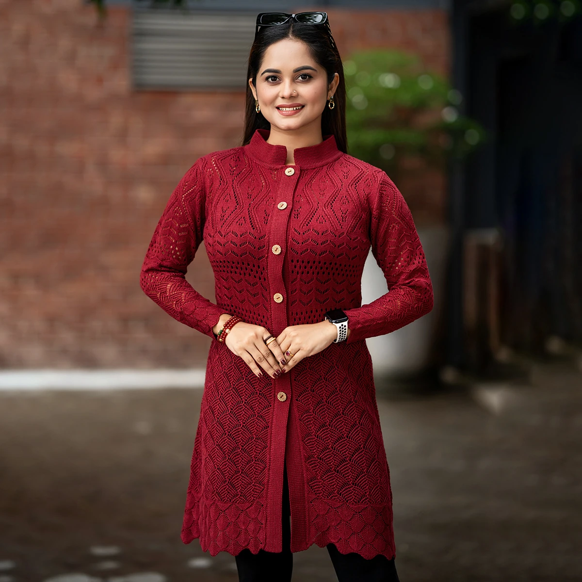 Add a touch of elegance to your winter wardrobe with this Maroon Long Knit Cardigan, designed for both comfort and style. Made from high-quality acrylic wool, this cardigan features a beautiful textured knit patternfull sleeves, and wooden front buttons for a refined finish. The high neck design ensures extra warmth during chilly days while maintaining a chic, modern look. Perfect for casual outings or office wear during the cold season.