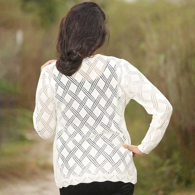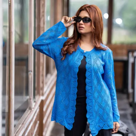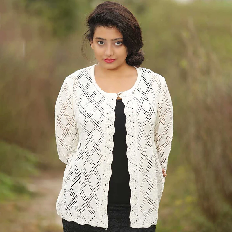 A beautifully crafted white open-knit cardigan designed for timeless elegance and comfort. Its intricate diamond-pattern design with scalloped borders makes it a perfect match for both casual and semi-formal occasions. Lightweight, breathable, and soft on the skin — this cardigan is your ideal layering choice year-round.